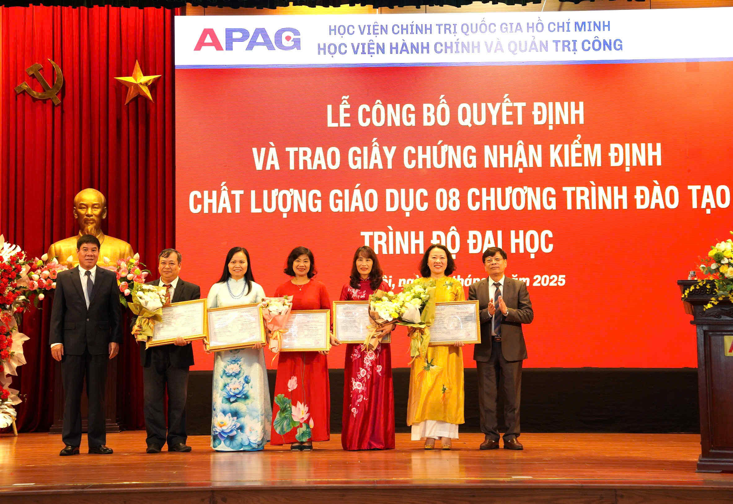 Sáng ngày 29/9/2025, trong không khí hân hoan chào mừng khai giảng các lớp đại học chính quy Khóa 25 (niên khóa 2025 - 2029), Học viện Hành chính và Quản trị công đã tổ chức Lễ Công bố quyết định, trao Giấy chứng nhận kiểm định chất lượng giáo dục 08 chương trình đào tạo trình độ đại học.