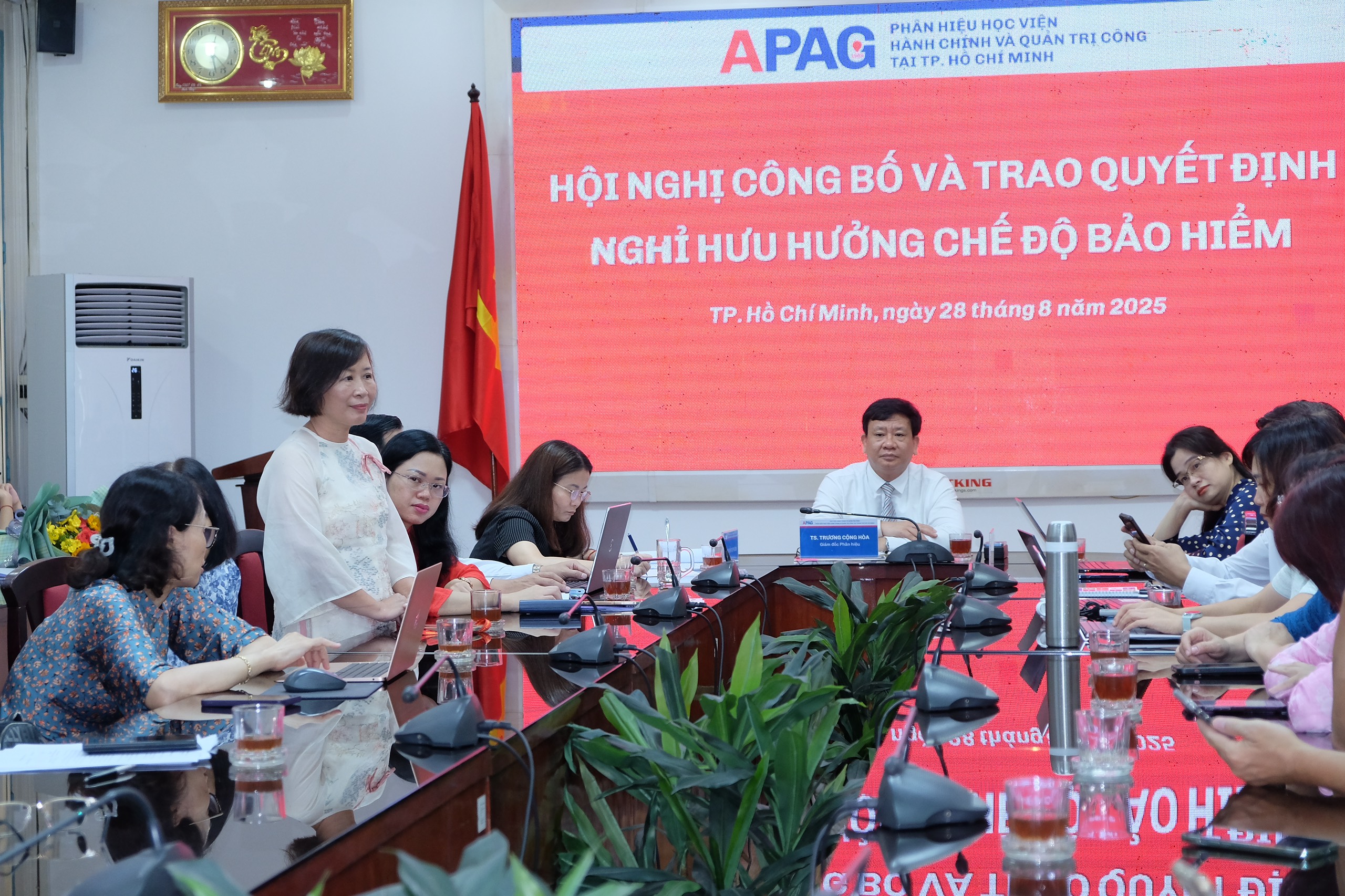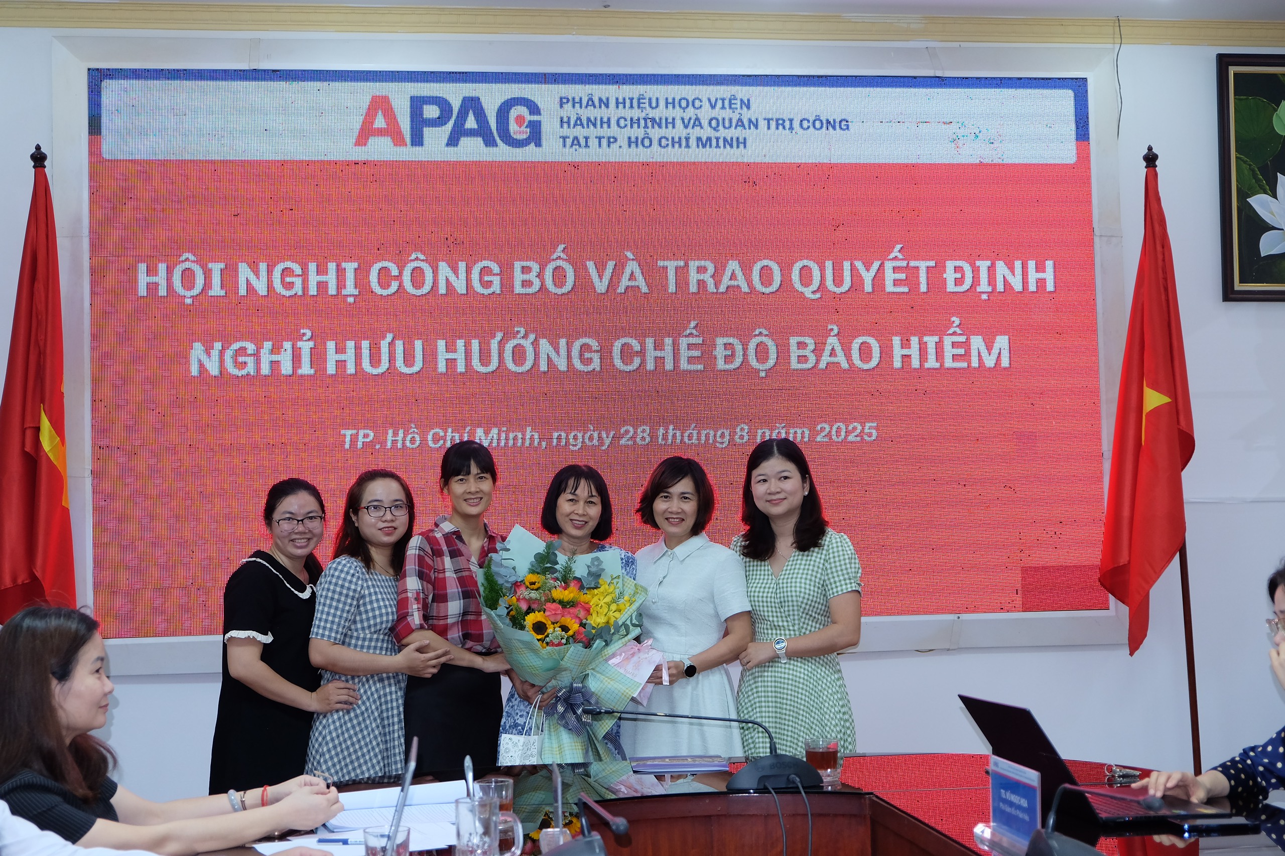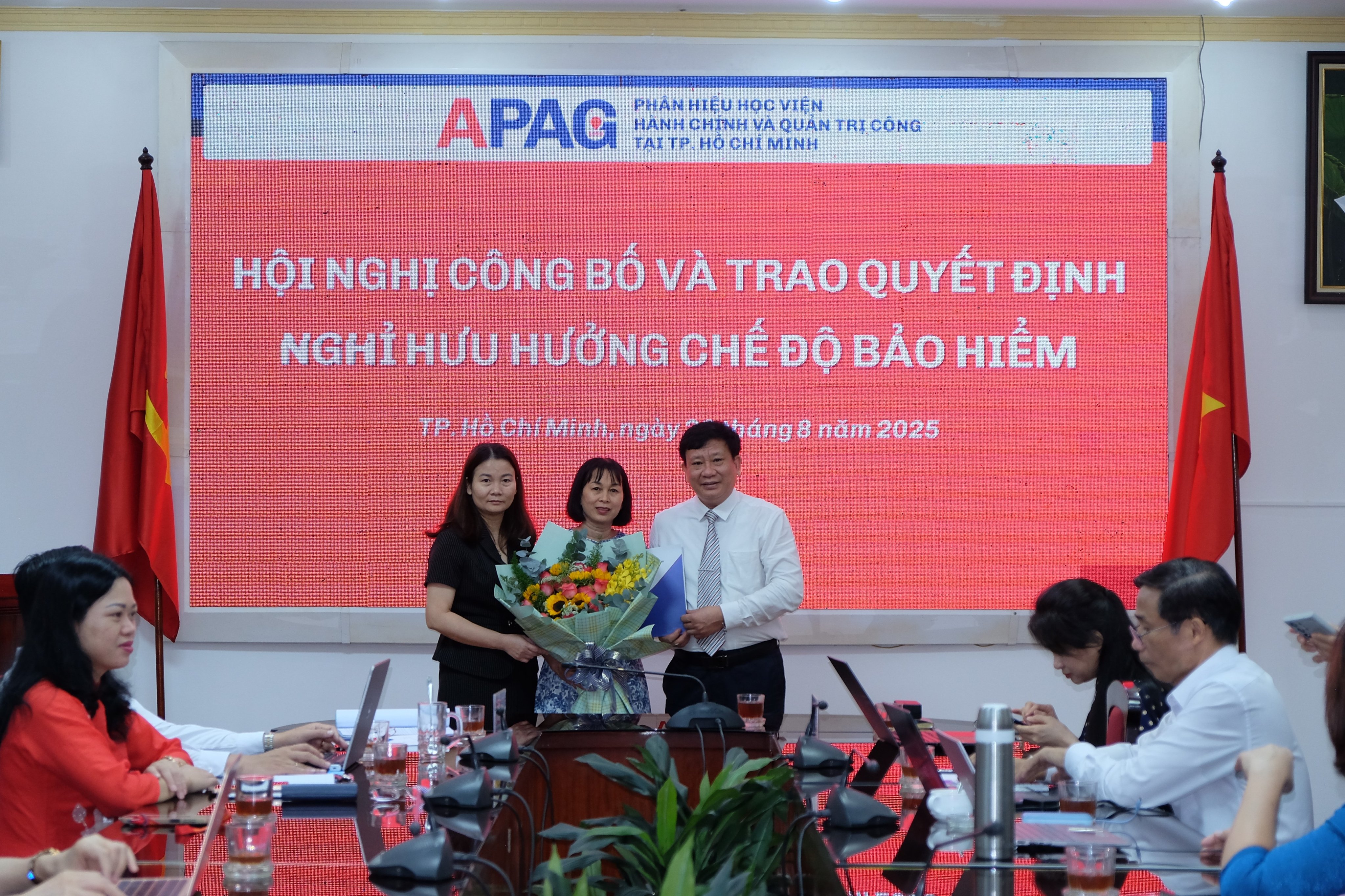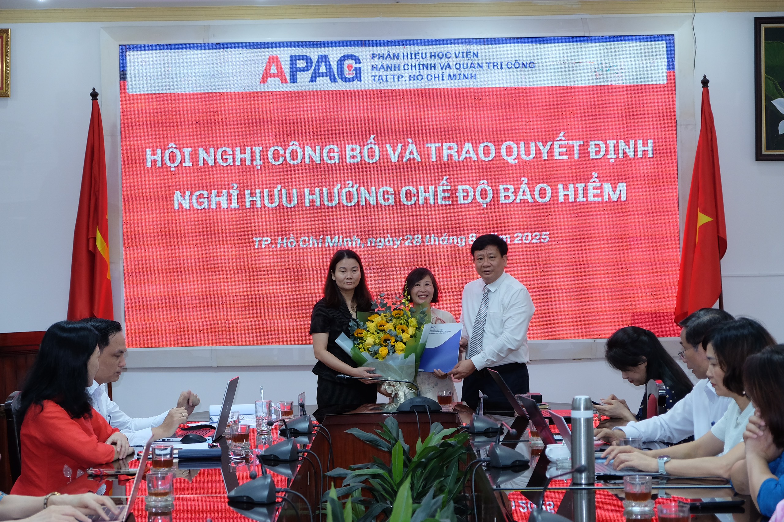 Theo đó, từ 01/9/2025, Phân hiệu Học viện Hành chính và Quản trị công tại TP. Hồ Chí Minh có 02 viên chức nghỉ hưu trước tuổi, gồm: đồng chí Nguyễn Thị Bình – Giảng viên Khoa Hành chính và Quản trị; đồng chí Bùi Thị Huệ – Giảng viên Khoa Luật và Khoa học Liên ngành.