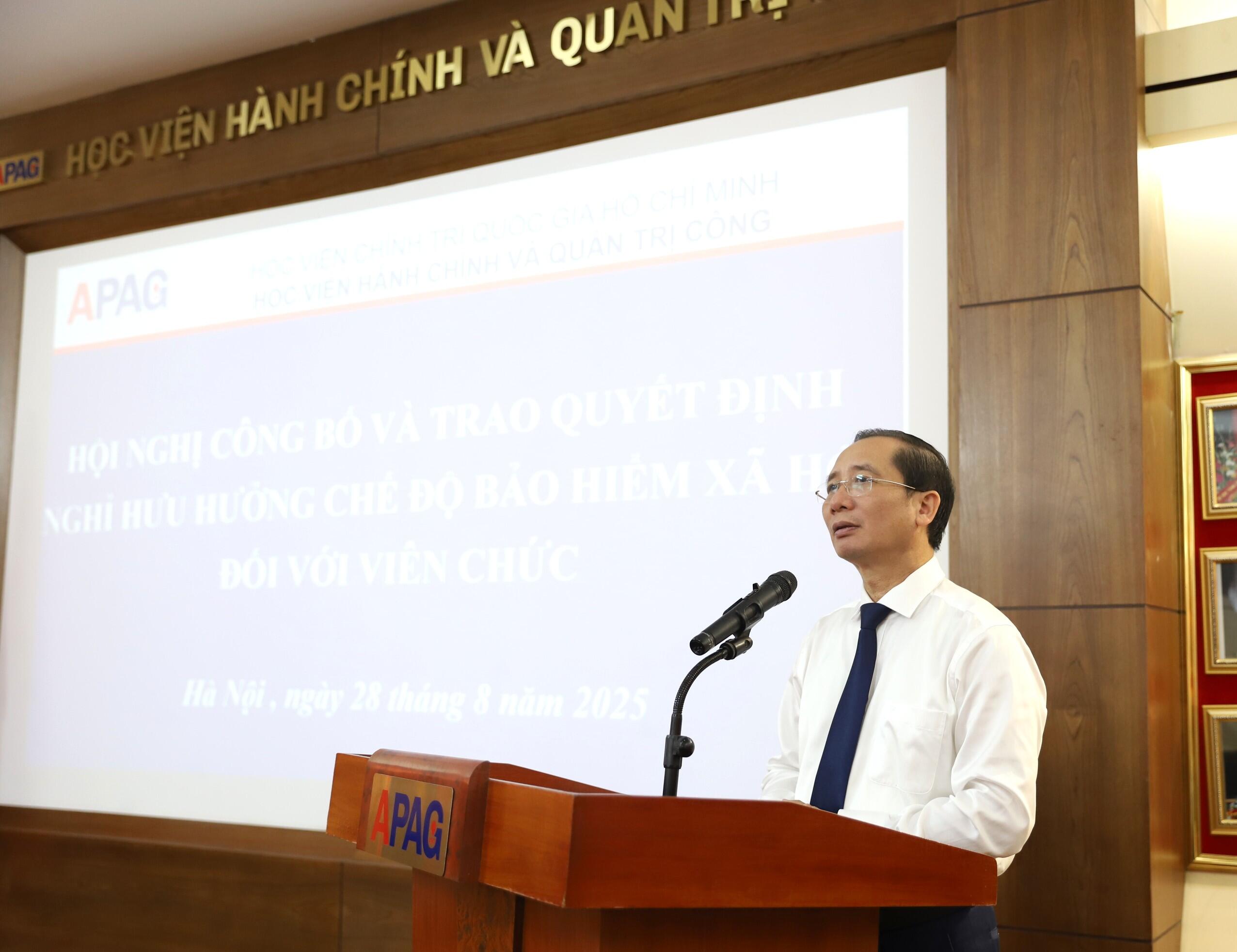 Sáng ngày 28/8/2025, tại Hà Nội, Học viện Hành chính và Quản trị công tổ chức Hội nghị công bố và trao quyết định viên chức nghỉ hưu trước tuổi, hưởng chế độ bảo hiểm xã hội. PGS.TS. Nguyễn Bá Chiến, Bí thư Đảng ủy, Giám đốc Học viện, chủ trì Hội nghị.