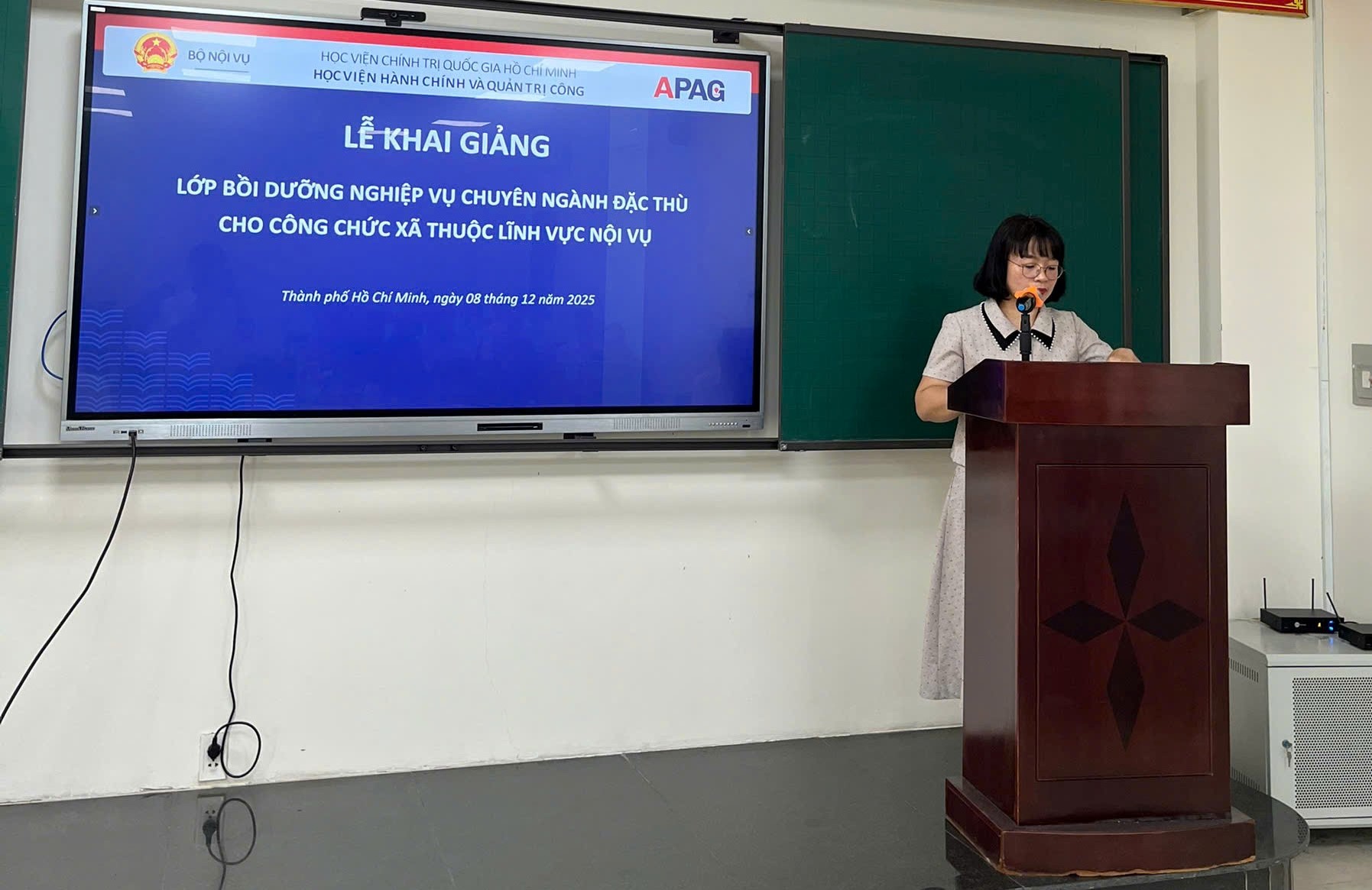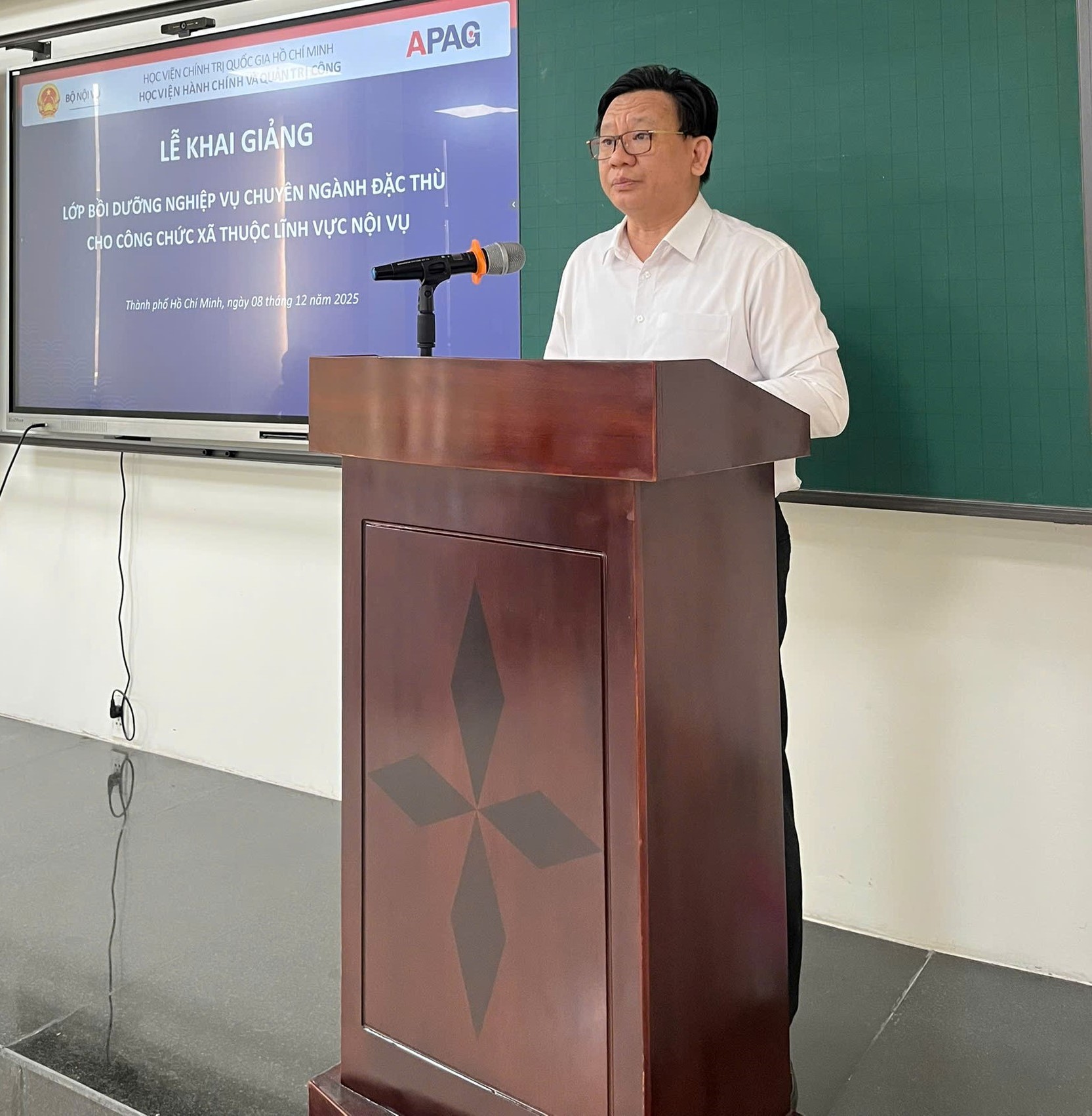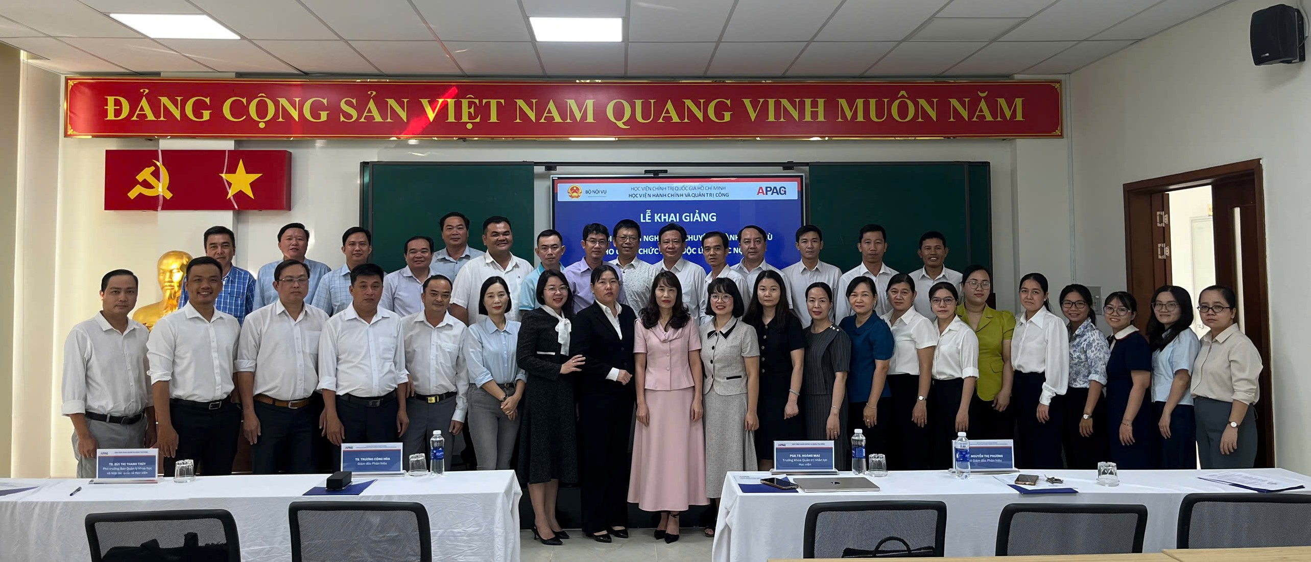 Sáng ngày 08/12/2025, Phân hiệu Học viện Hành chính và Quản trị công tại TP. Hồ Chí Minh (Phân hiệu) long trọng tổ chức Lễ Khai giảng Lớp “Bồi dưỡng nghiệp vụ chuyên ngành đặc thù cho công chức xã thuộc lĩnh vực Nội vụ” năm 2025 - Lớp 2. Đây là nhiệm vụ được Bộ Nội vụ giao cho Học viện Hành chính và Quản trị công (Học viện) trong khuôn khổ Chương trình mục tiêu quốc gia xây dựng nông thôn mới giai đoạn 2021 - 2025 theo Quyết định số 263/QĐ-TTg của Thủ tướng Chính phủ.