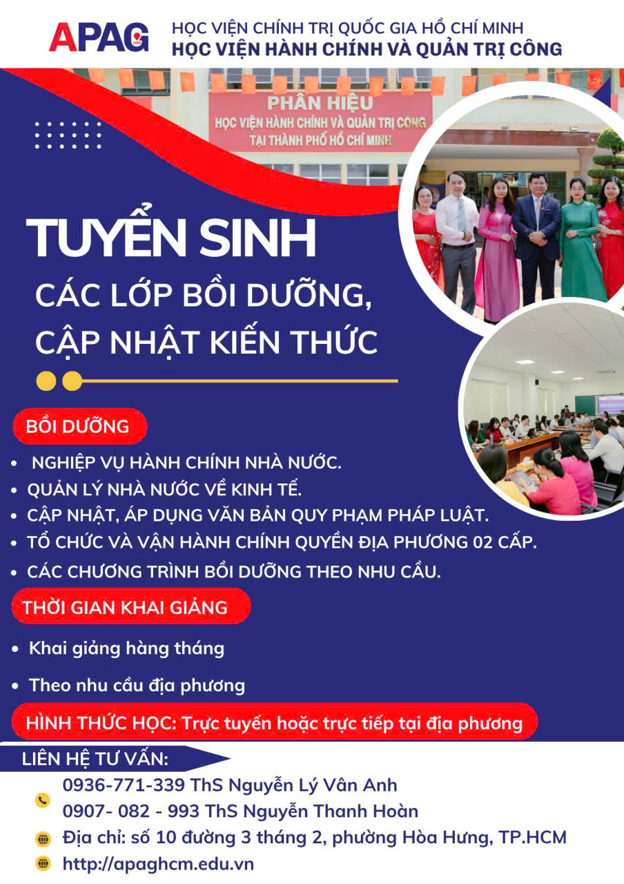 Phân hiệu Học viện Hành chính và Quản trị công tại Thành phố Hồ Chí Minh thông báo tuyển sinh các lớp bồi dưỡng, cập nhật kiến thức dành cho cán bộ, công chức, viên chức và những người có nhu cầu nâng cao năng lực trong lĩnh vực hành chính và quản lý nhà nước, cụ thể như sau: