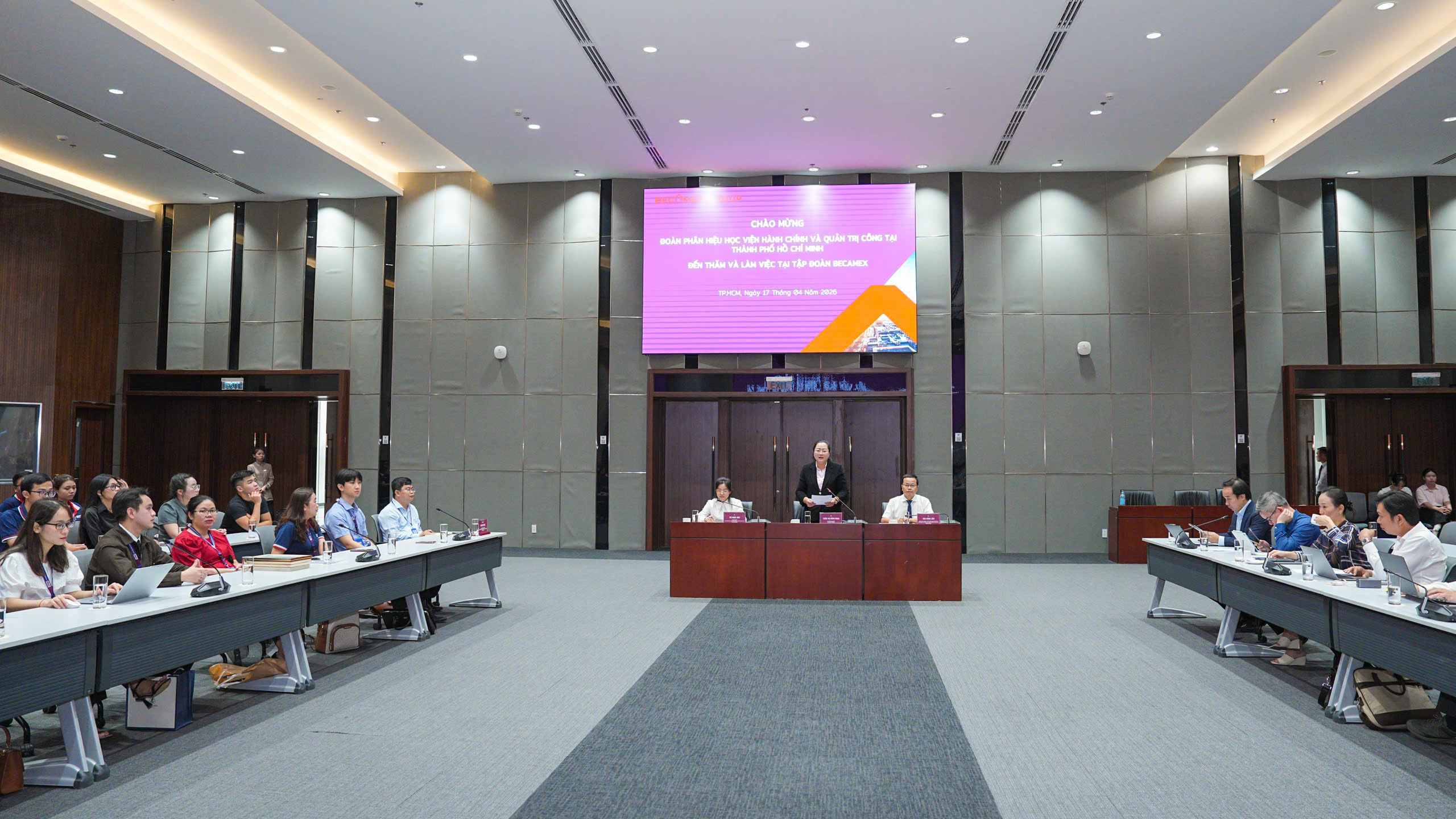 Tại buổi làm việc, đoàn đã được tìm hiểu tổng quan về quá trình hình thành và phát triển của Tập đoàn Becamex, tham quan hệ sinh thái công nghiệp - khoa học công nghệ - đổi mới sáng tạo, đồng thời trao đổi nhiều nội dung thiết thực liên quan đến chiến lược nâng cao hiệu quả nền hành chính công, tác động của cải cách hành chính và hội nhập quốc tế đối với doanh nghiệp trong bối cảnh hiện nay. Đây là những nội dung có giá trị thực tiễn sâu sắc, góp phần gắn kết giữa lý luận đào tạo với yêu cầu phát triển của xã hội và nền kinh tế.