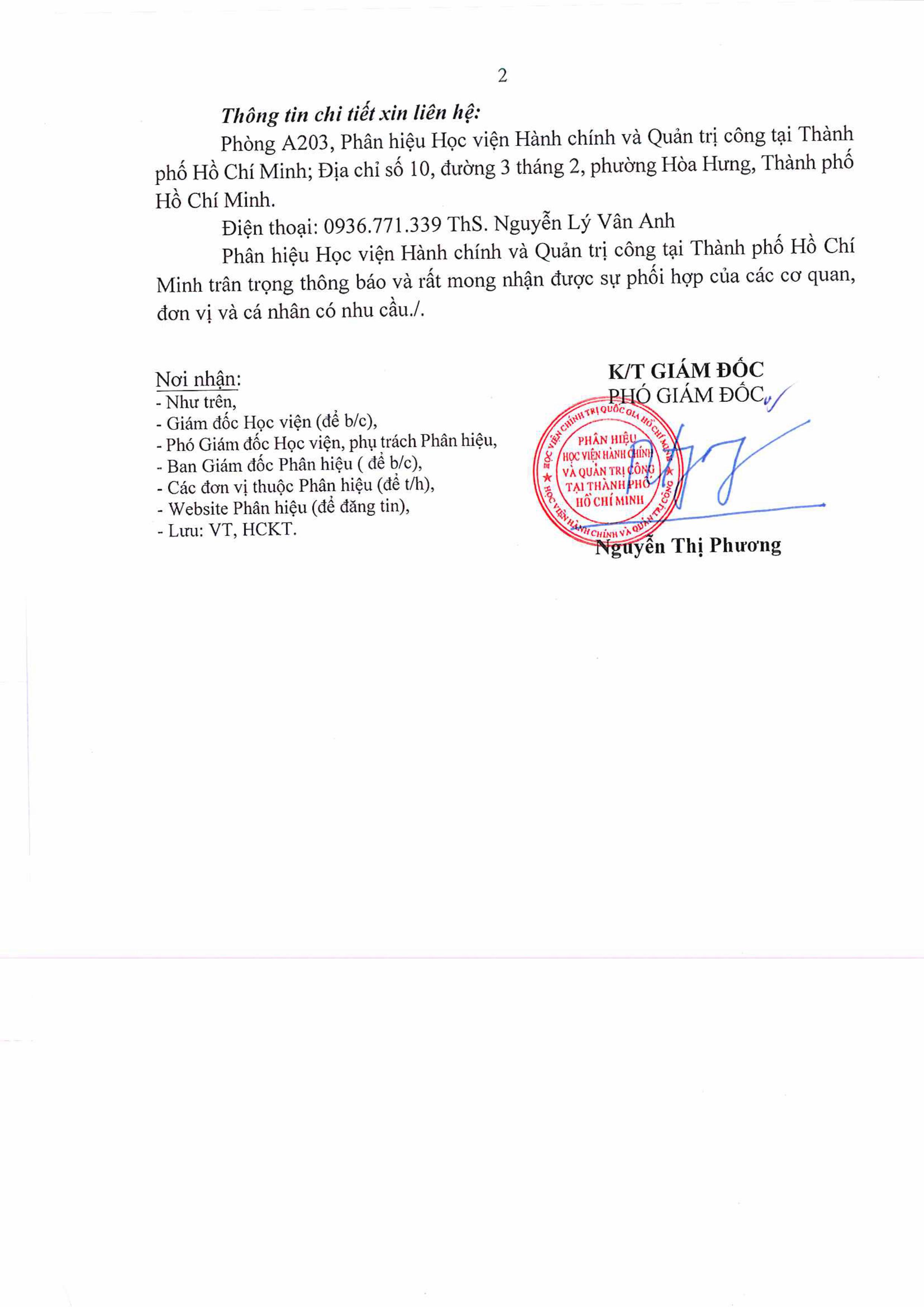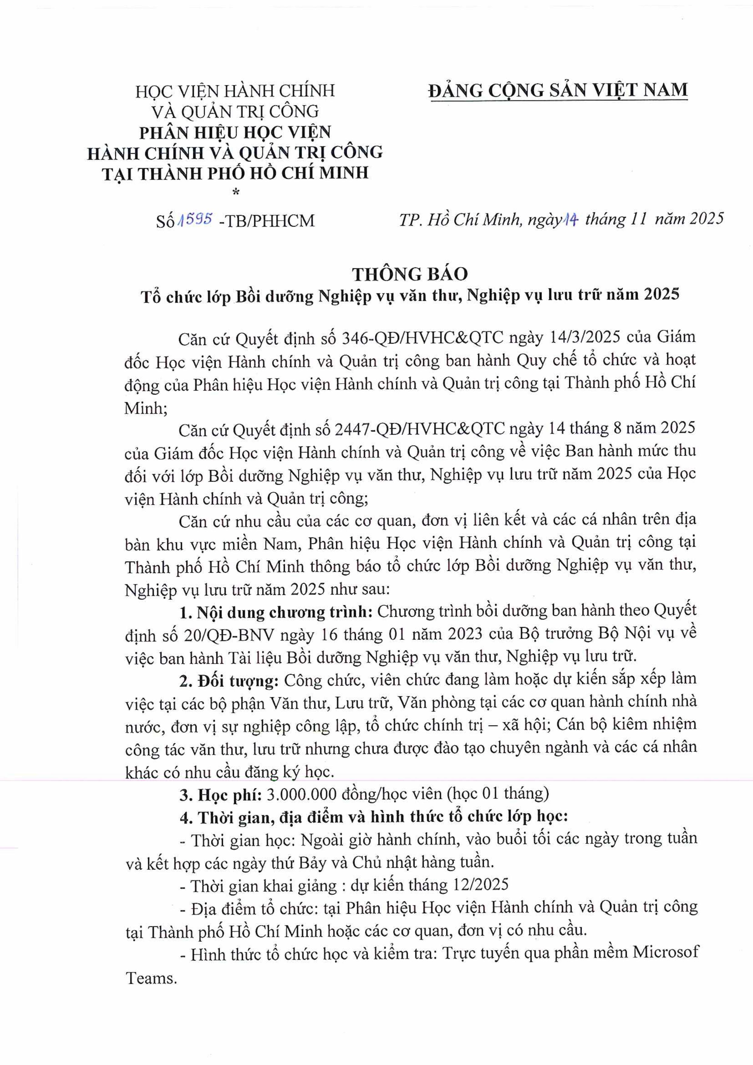 Ngày 14 tháng 11 năm 2025, Phân hiệu Học viện Hành chính và Quản trị công tại Thành phố Hồ Chí Minh ban hành Thông báo số 1595/TB-PHHCM về việc tổ chức lớp Bồi dưỡng Nghiệp vụ văn thư, Nghiệp vụ lưu trữ năm 2025, cụ thể như sau: