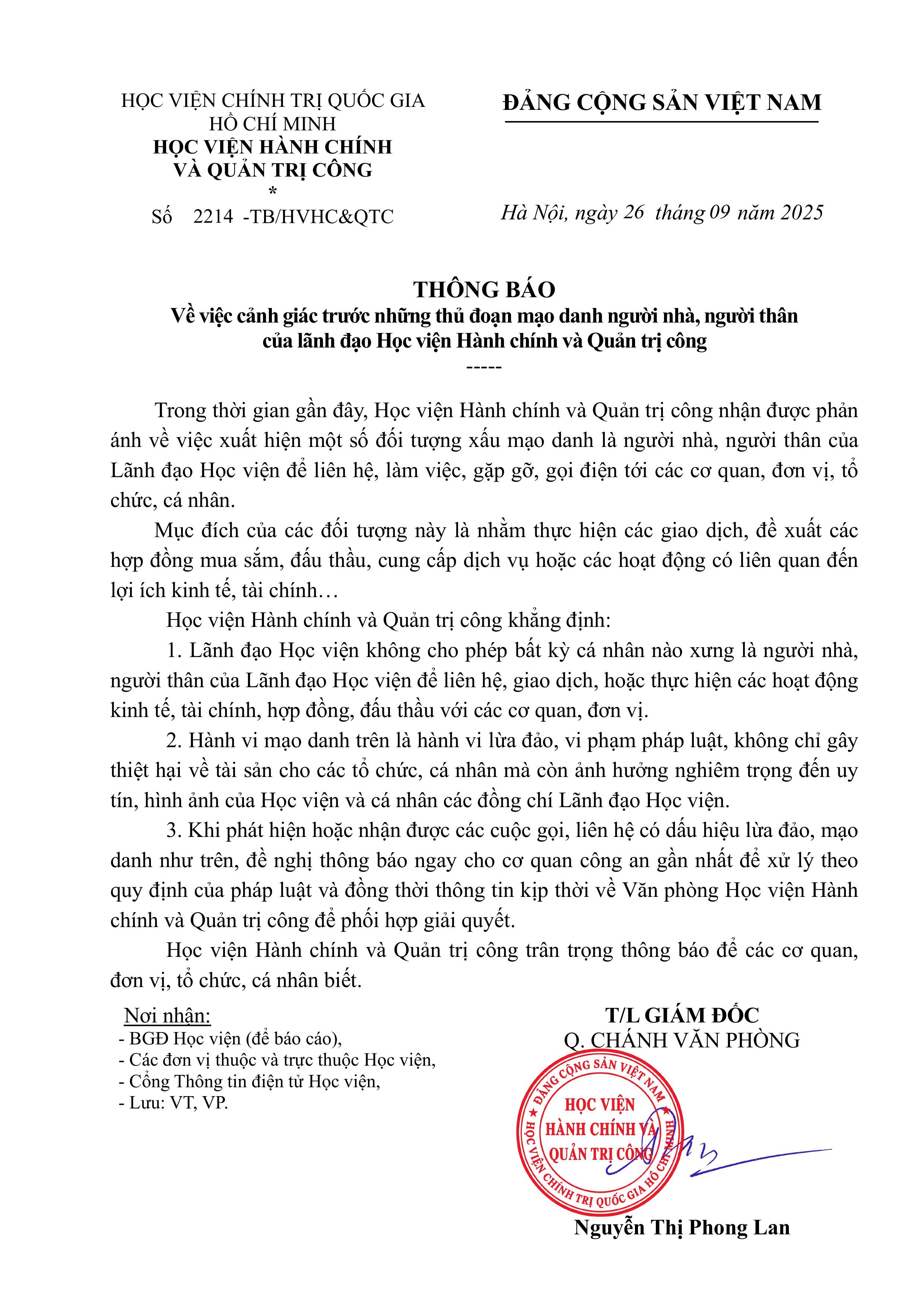 Thông báo về việc cảnh giác trước những thủ đoạn mạo danh người nhà, người thân của lãnh đạo Học viện Hành chính và Quản trị công