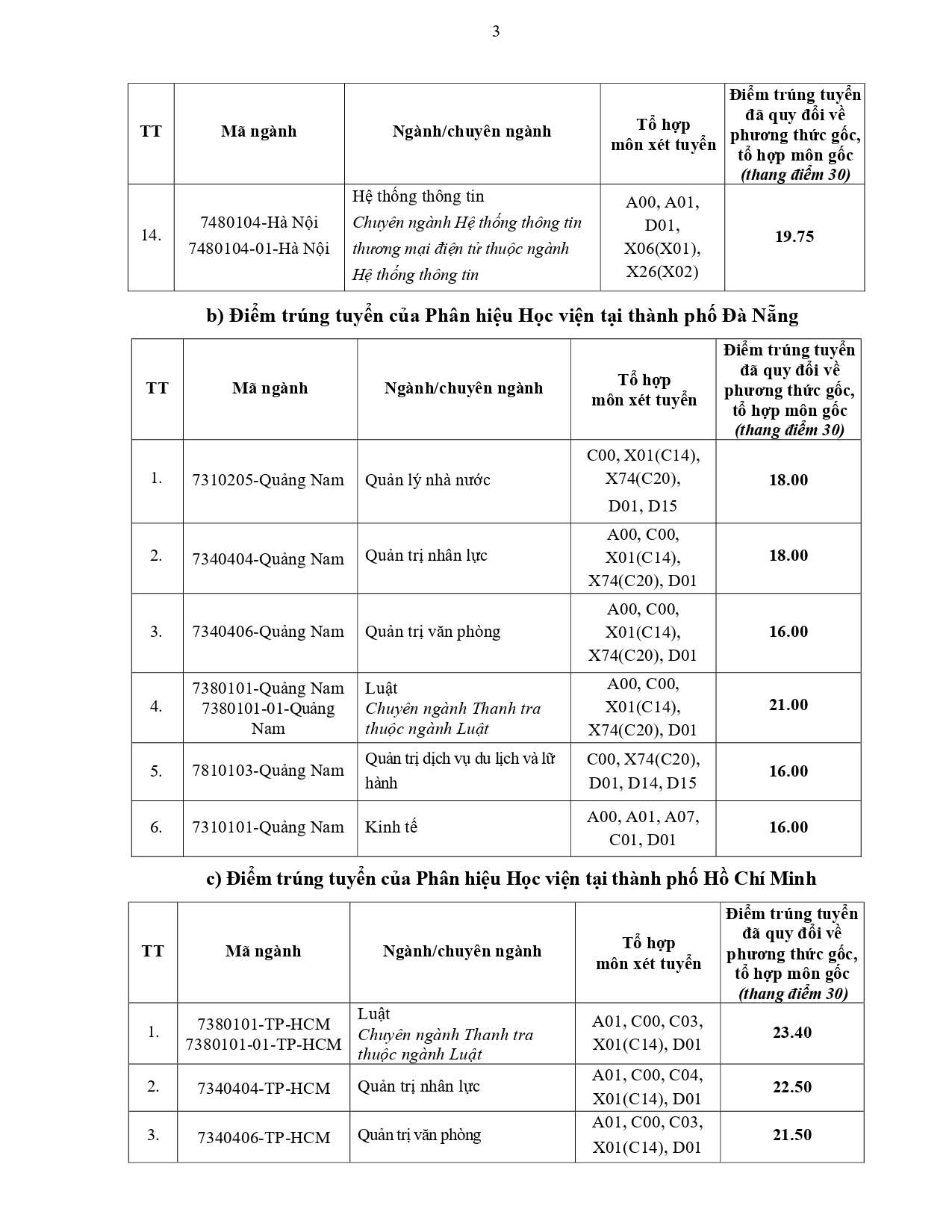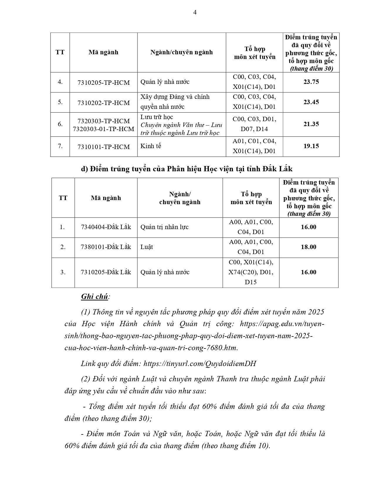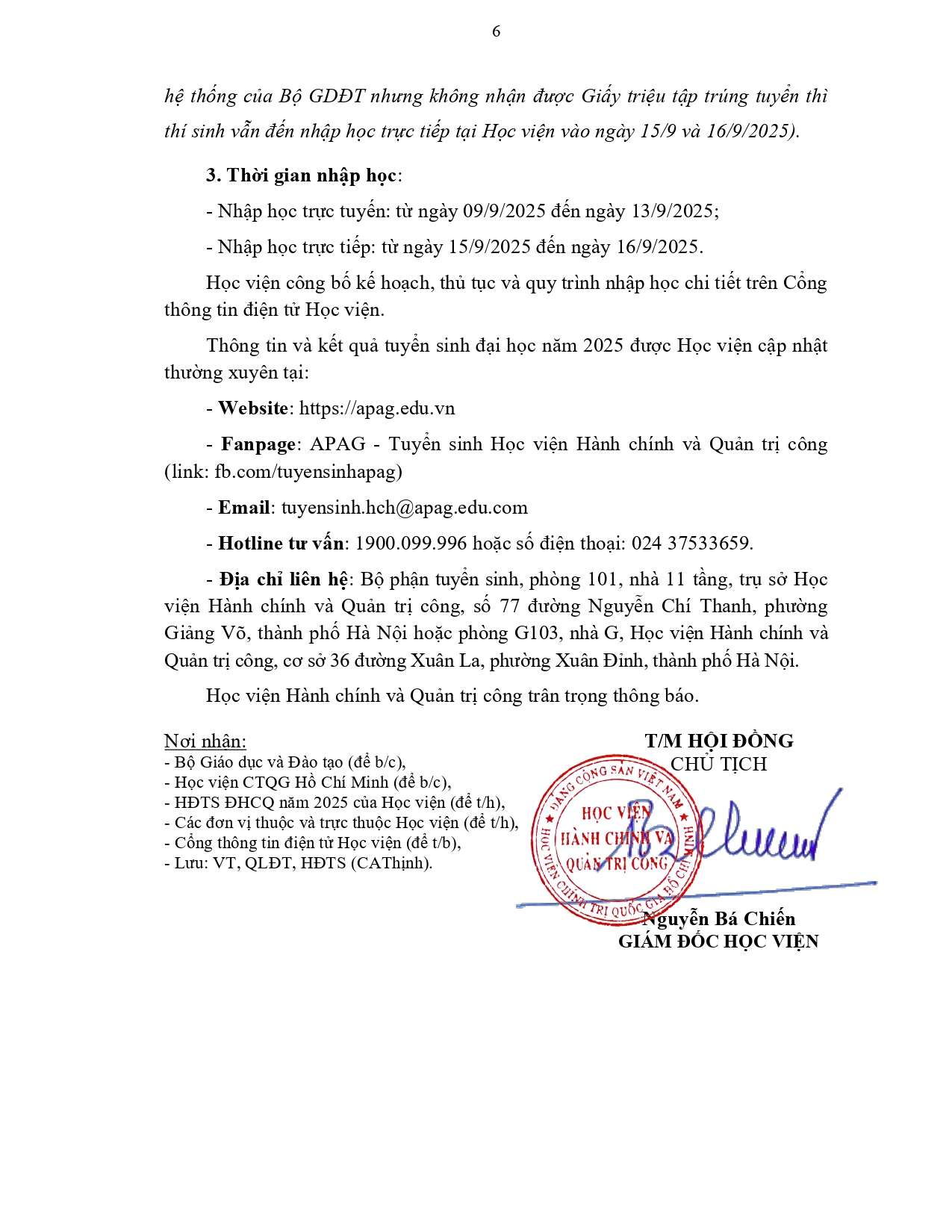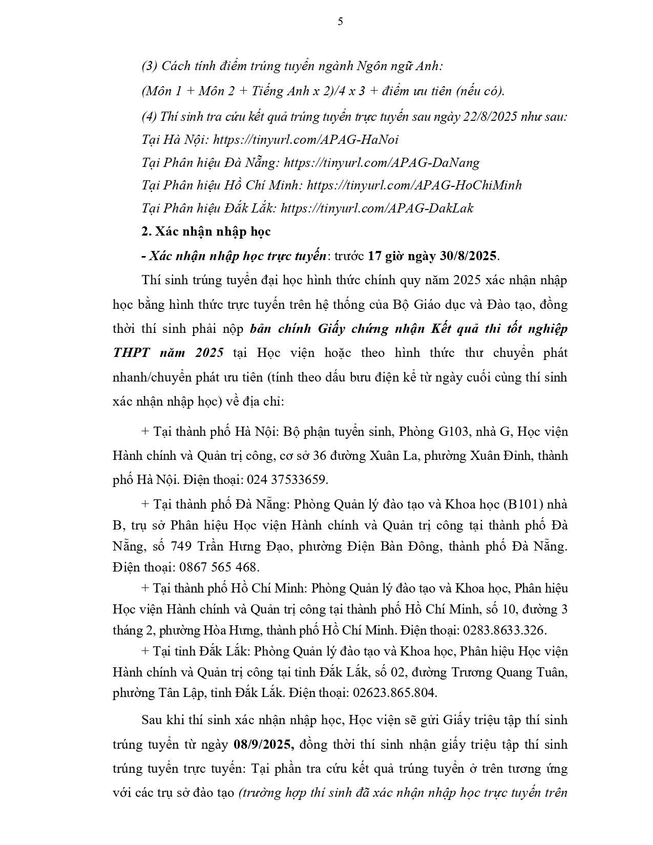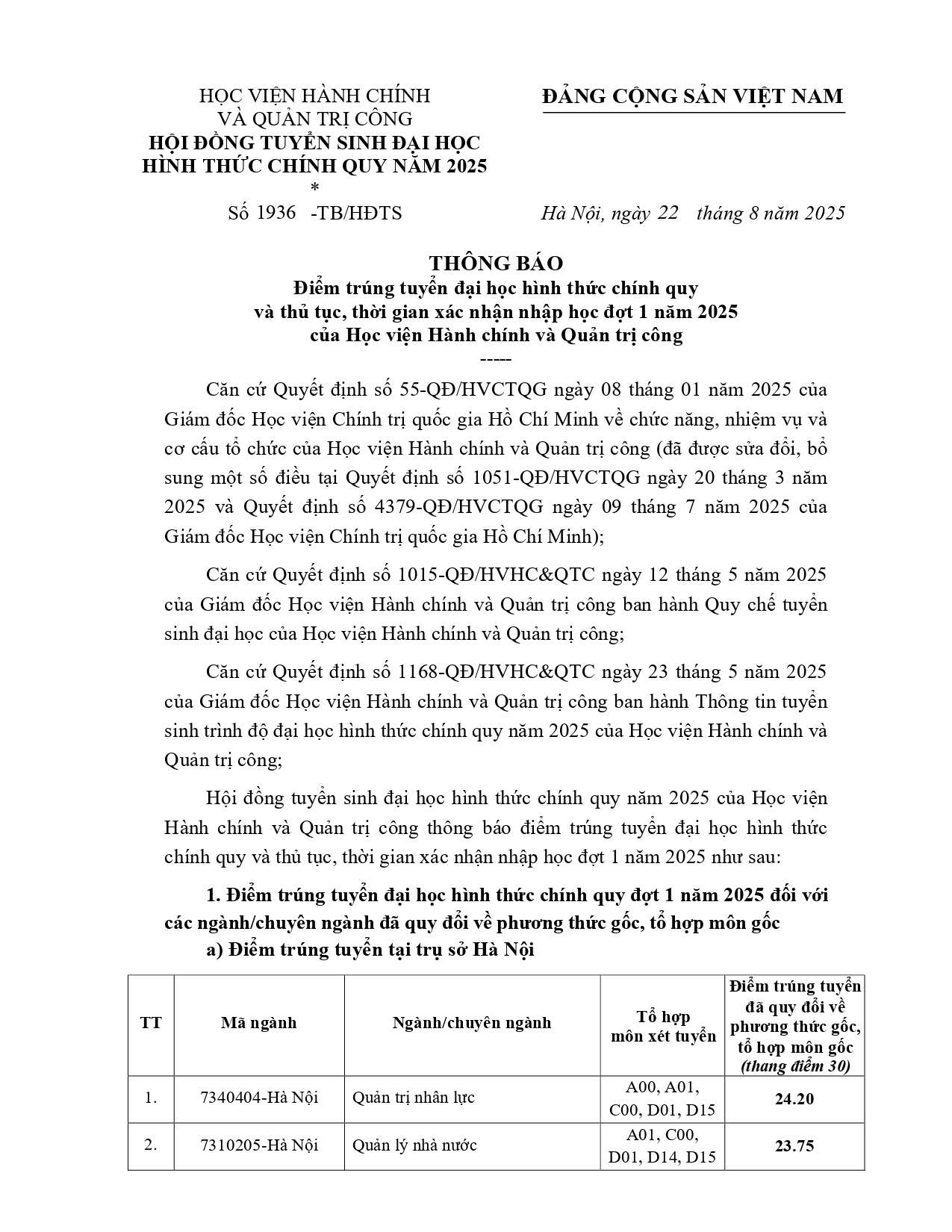 Học viện Hành chính và Quản trị công thông báo điểm trúng tuyển đại học hình thức chính quy và thủ tục, thời gian xác nhận nhập học đợt 1 năm 2025, cụ thể như sau: